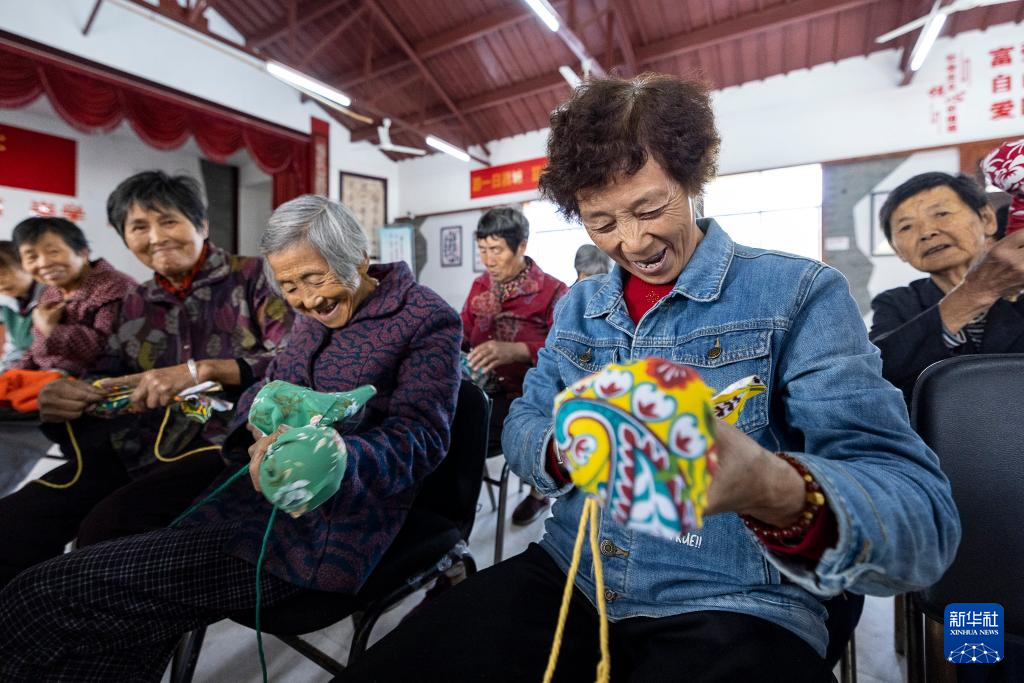 10月27日,浙江省湖州市吴兴区道场乡菰城村,老人在迎重阳活动上做艾锤。