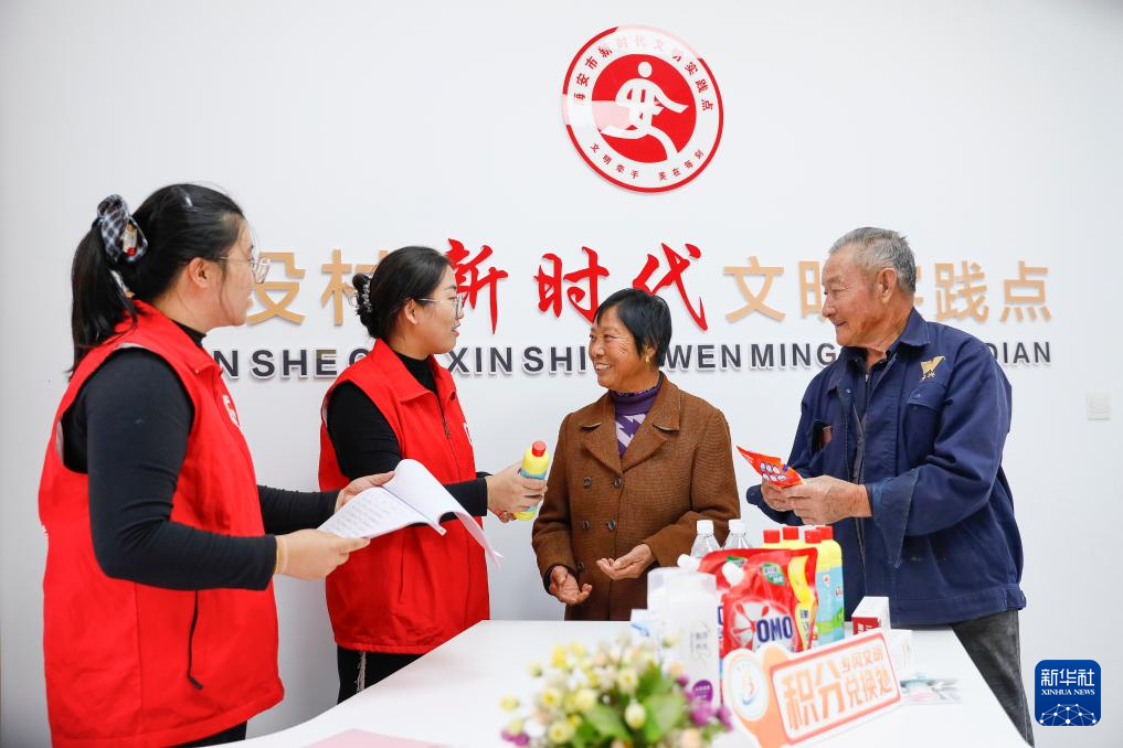 10月25日,江苏省海安高新区隆政街道建设村村民凭文明乡风积分存折兑换日用品。