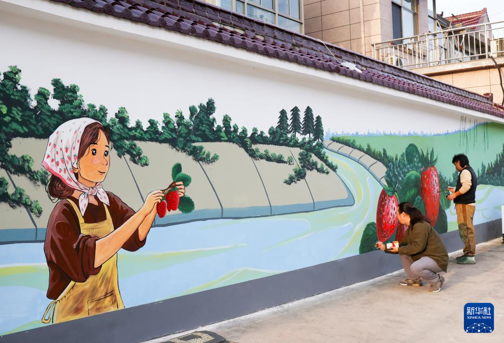 10月27日,江苏省兴化市垛田街道垛田农民画创作者在创作垛田农民画墙绘。