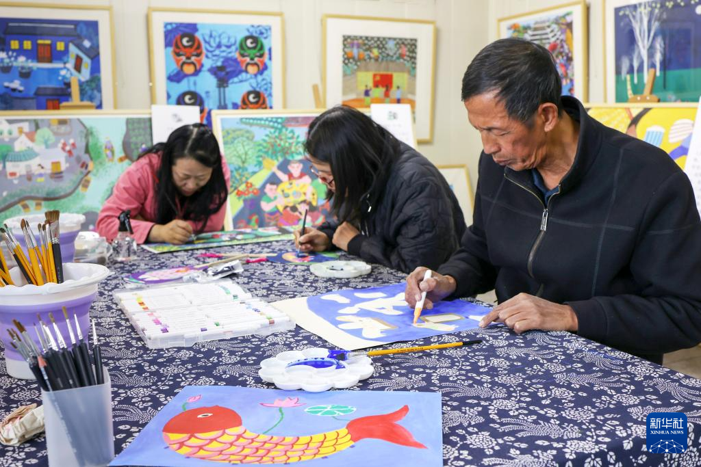 10月27日,在江苏省兴化市垛田街道新时代文明实践所,垛田农民画创作爱好者在创作作品。