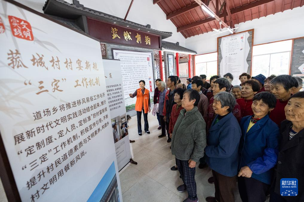10月27日,在浙江省湖州市吴兴区道场乡菰城村,志愿者向村民介绍村宴新规。