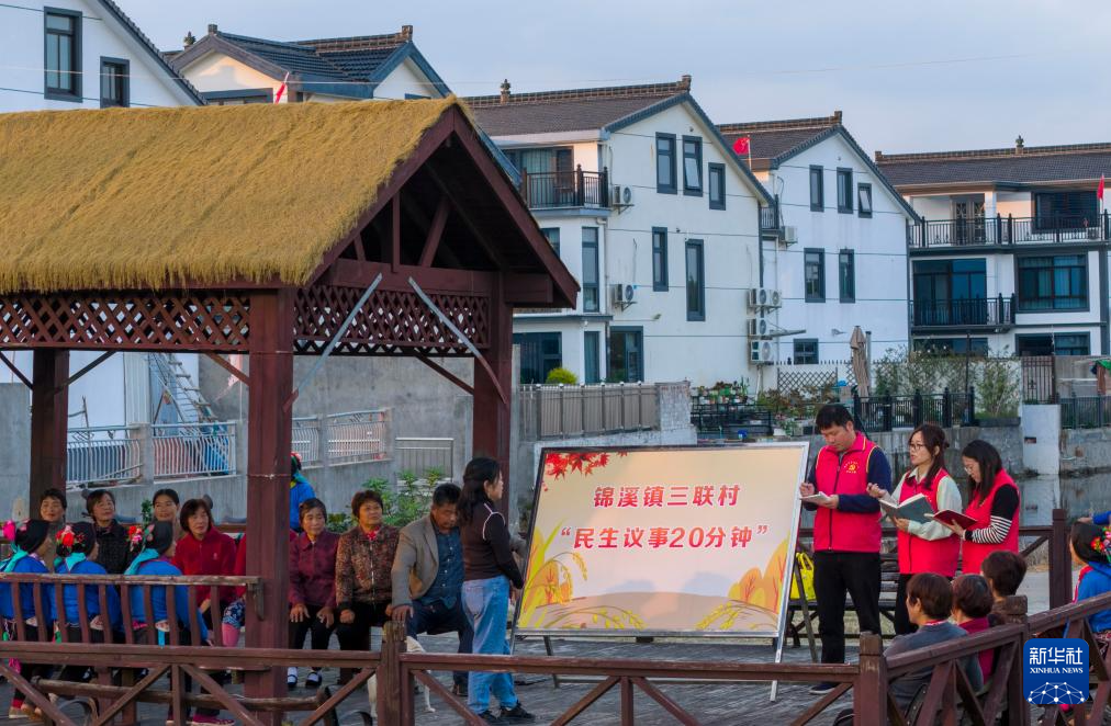 10月25日,江苏省昆山市锦溪镇三联村村干部和村民代表在村头连廊议事(无人机照片)。