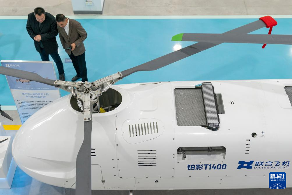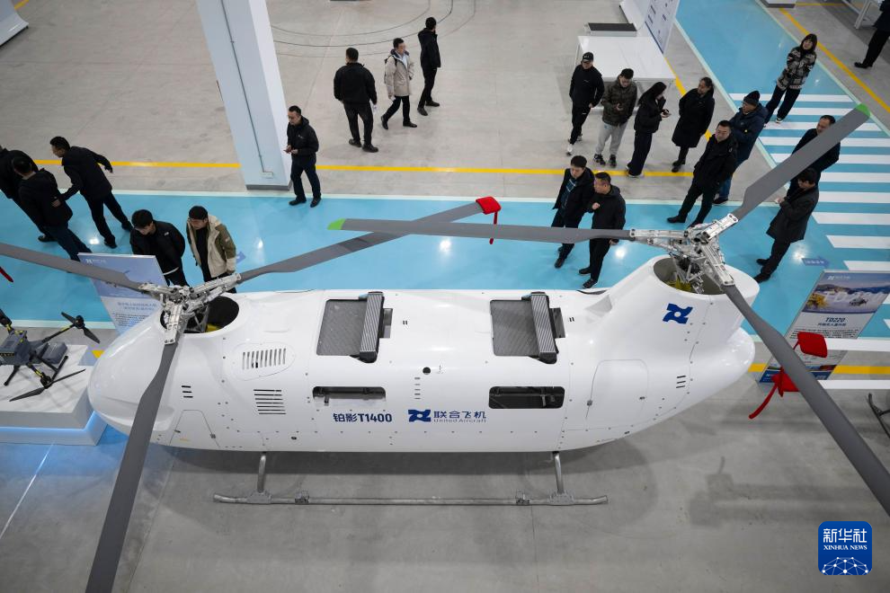 10月30日,在哈尔滨市平房区的哈尔滨联合飞机科技有限公司生产厂区,参会人员参观T1400无人直升机。