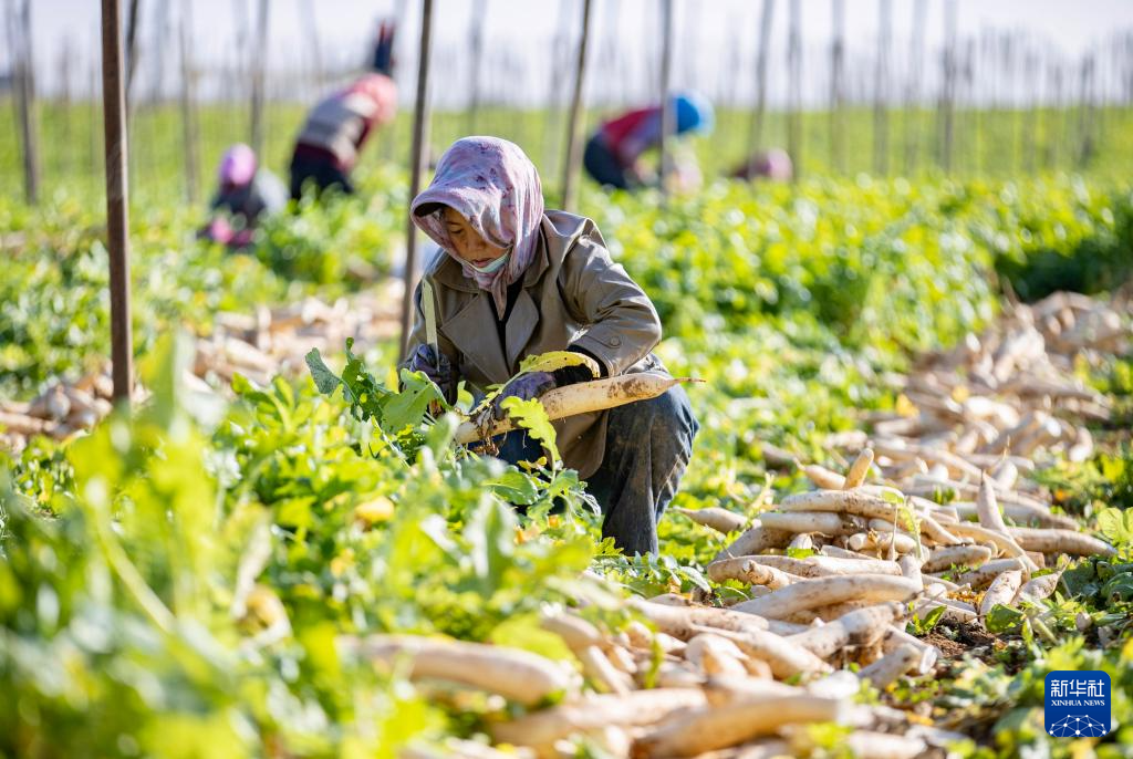 10月29日,农民在宁夏吴忠市红寺堡区红寺堡镇弘德村采收萝卜。