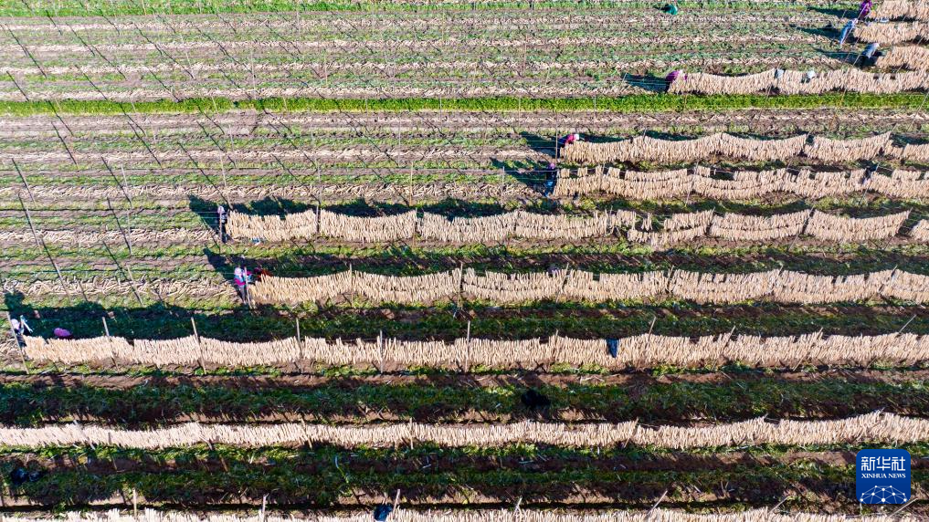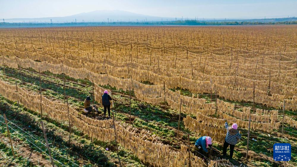 10月29日,农民在宁夏吴忠市红寺堡区红寺堡镇弘德村晾晒萝卜条(无人机照片)。