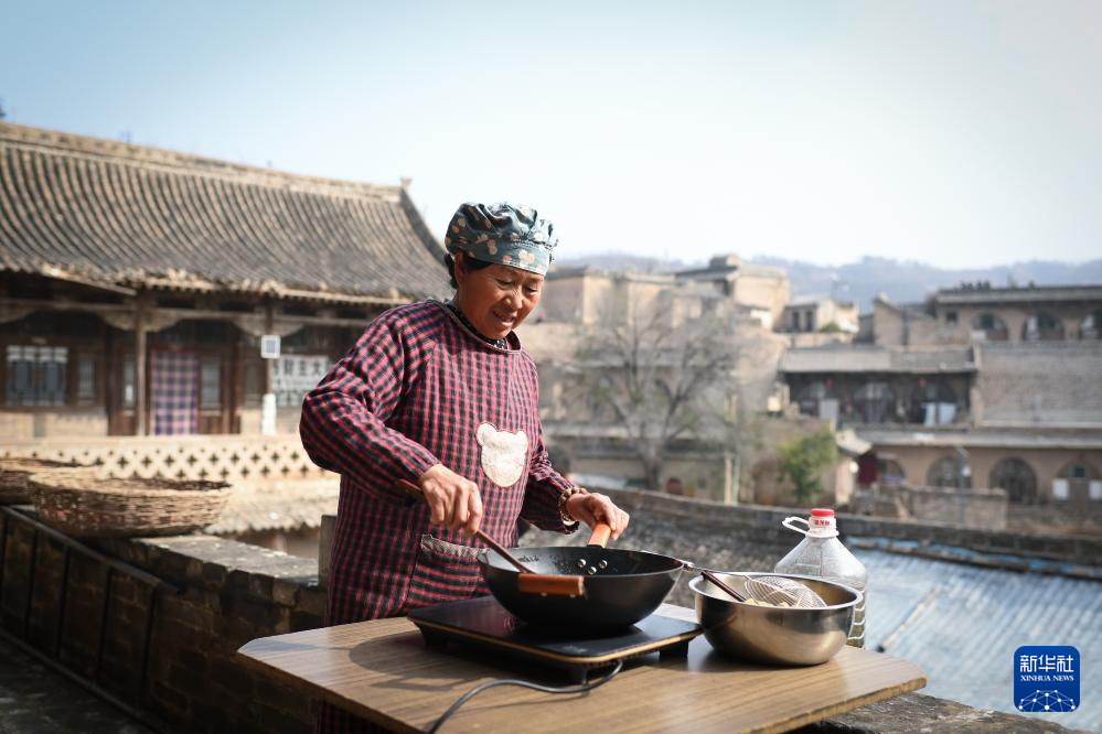 在山西省吕梁市临县碛口古镇,村民在院子里做油糕(10月30日摄)。