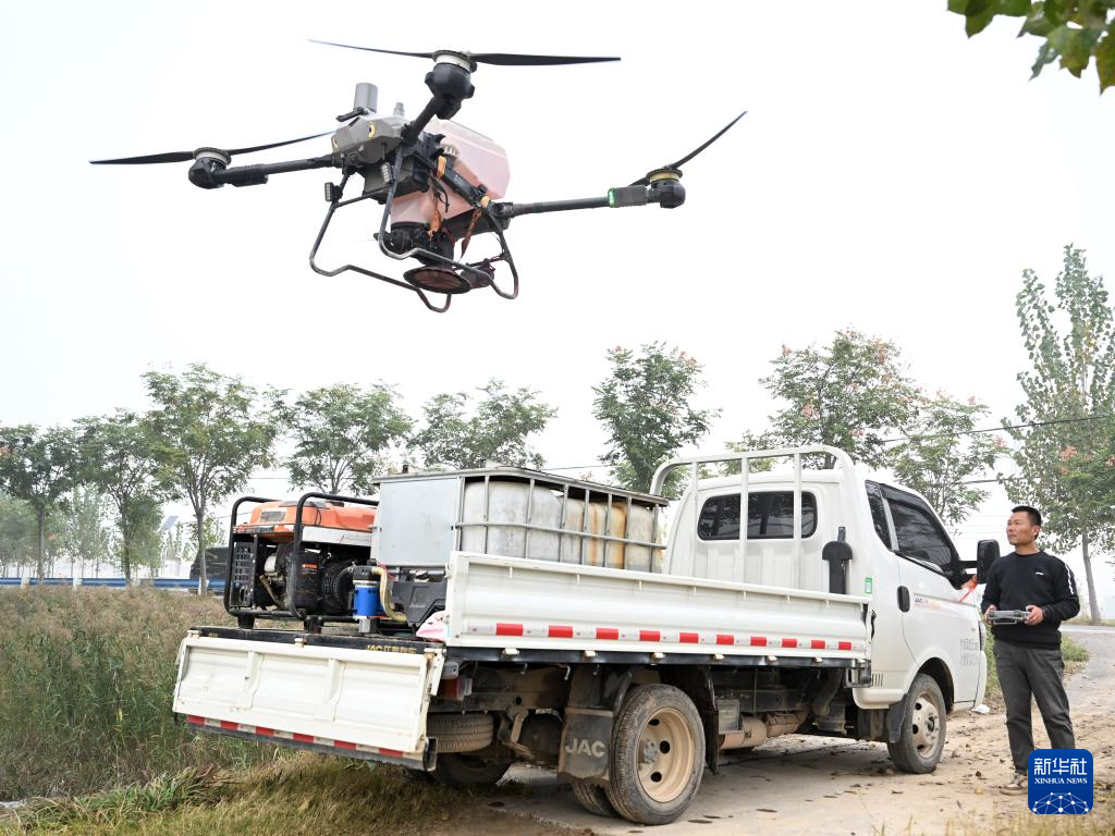 10月30日,在河南省清丰县固城镇张庄里村,农户在操作无人巡田机起飞。
