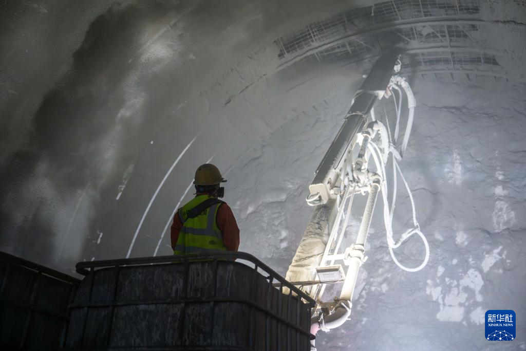 11月1日,在邵永高铁东安隧道施工现场,中铁二十五局工人操作湿喷台车进行喷浆作业。