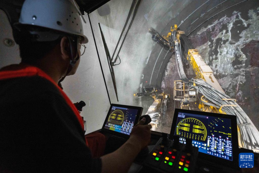11月1日,在邵永高铁东安隧道施工现场,中铁二十五局工人操作三臂凿岩台车进行钻孔作业。