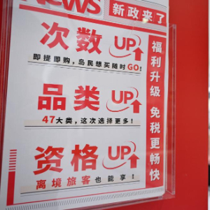这是海口日月广场免税店内的免税购物新政展板(11月1日摄)。