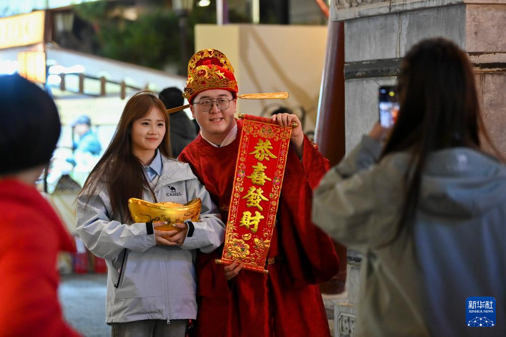 游客和表演人员在钟楼街合影(11月1日摄)。