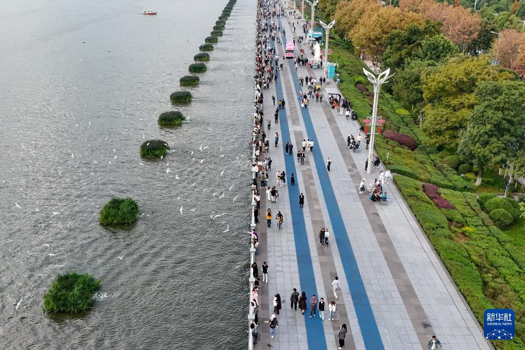 11月1日,游客在滇池畔的海埂大坝游玩、喂鸥(无人机照片)。
