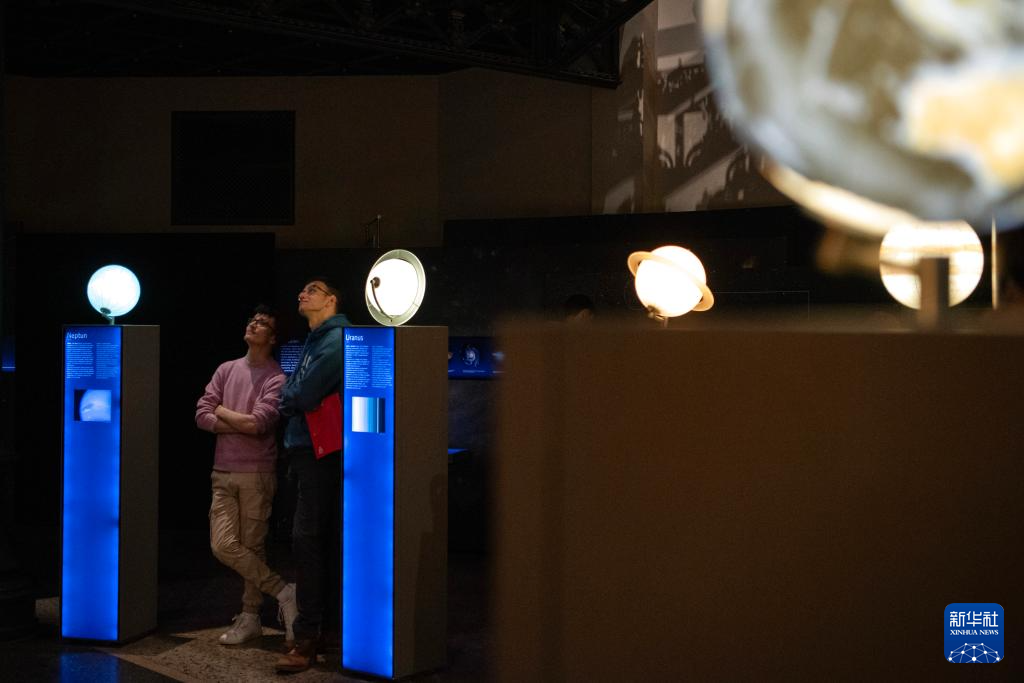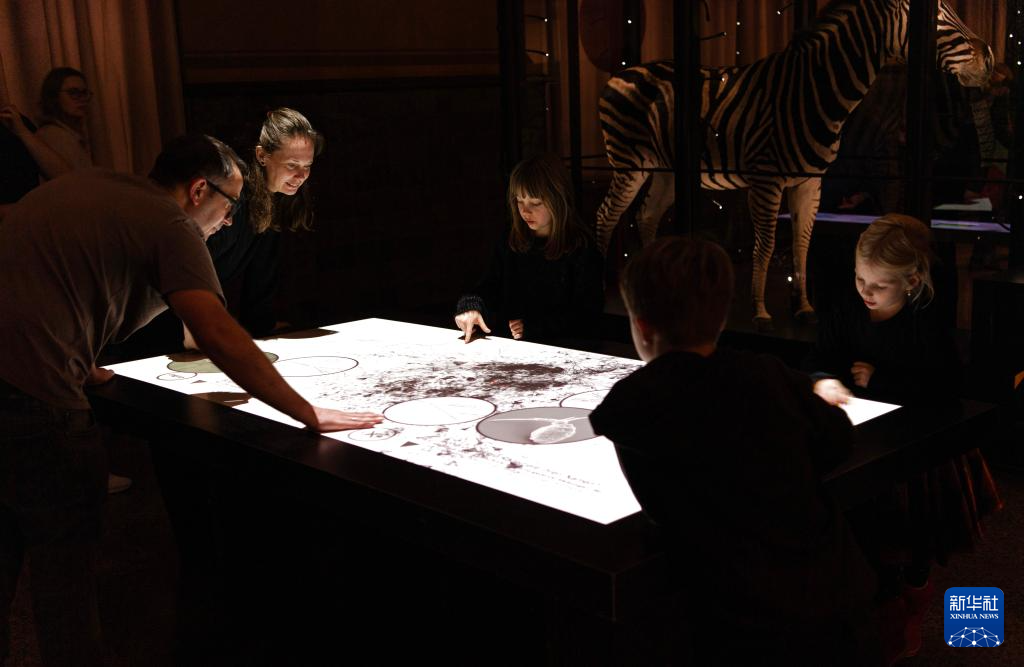 11月1日,在德国柏林自然历史博物馆,人们体验一款互动科普装置。