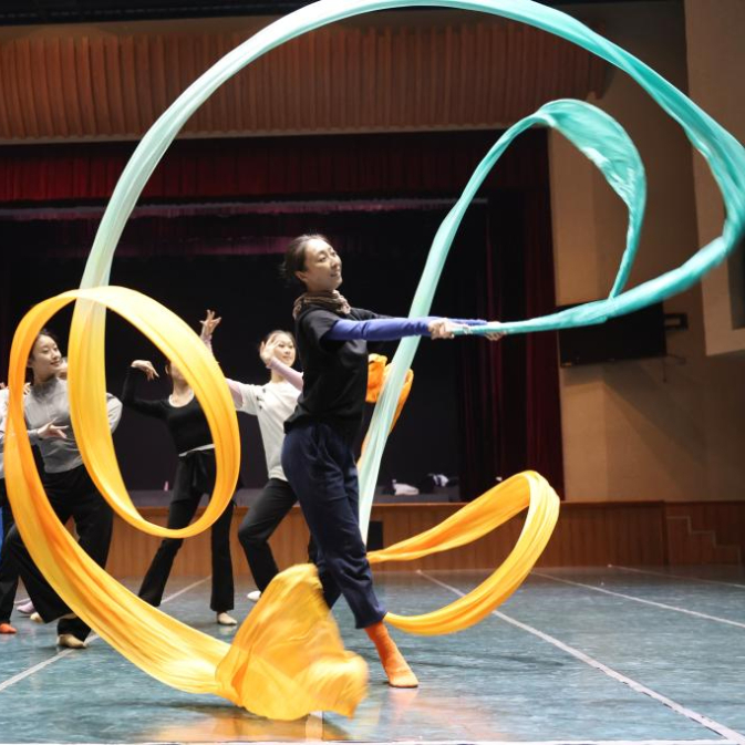 托掌、端腿、出胯、勾脚,一个个飞天舞姿翩然浮现。反弹琵琶、长绸轻舞,“动中有静,静中有动”,尽显东方美学优雅。在甘肃省歌舞剧院,演员们正在排练新版《丝路花雨》。