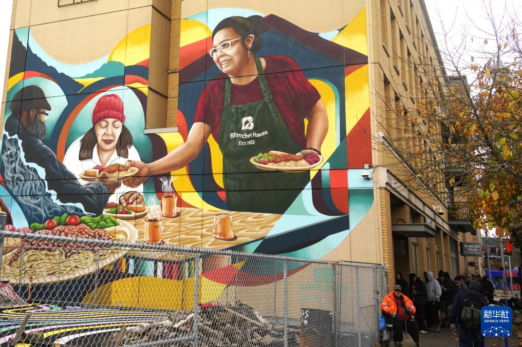 11月4日,在美国俄勒冈州波特兰,等待领取免费食物的人们排起长队。