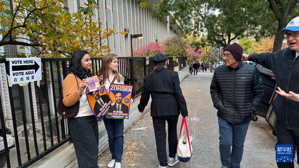 11月4日,支持者在美国纽约一个投票站外展示候选人祖赫兰·马姆达尼的竞选海报(手机拍摄)。