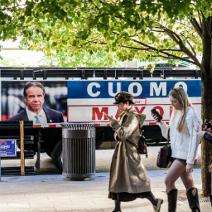 11月4日,在美国纽约,行人经过候选人安德鲁·科莫的竞选海报。