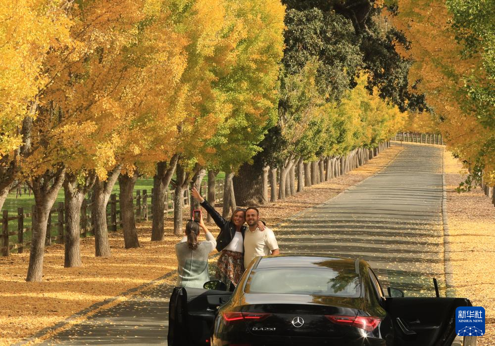 11月4日,在美国加州纳帕谷,一对夫妇在银杏大道拍照。