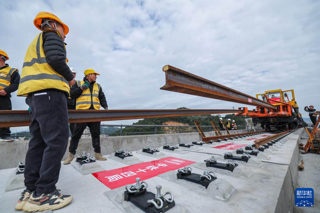 11月5日,在浙江省台州市杭台高铁温岭至玉环段施工作业现场,中铁十四局工作人员操作长轨牵引车将首段500米长钢轨精准铺设在无砟道床上。