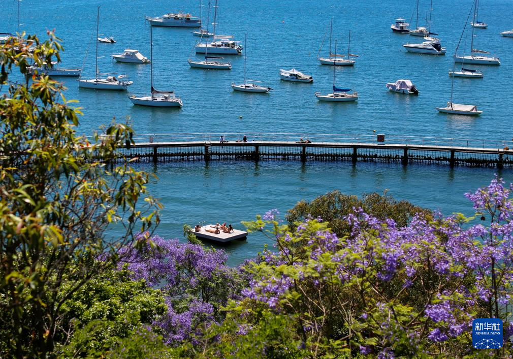 11月5日,在澳大利亚悉尼,人们在蓝花楹环绕下的海滩边休息。