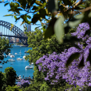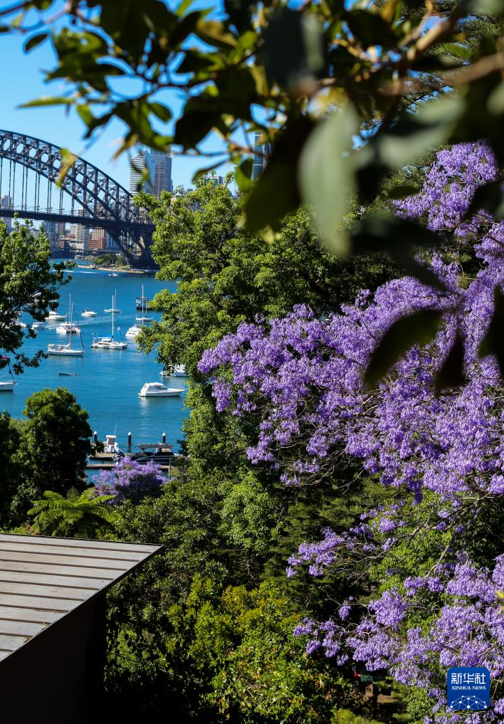 这是11月5日在澳大利亚北悉尼拍摄的盛开的蓝花楹和海港大桥。