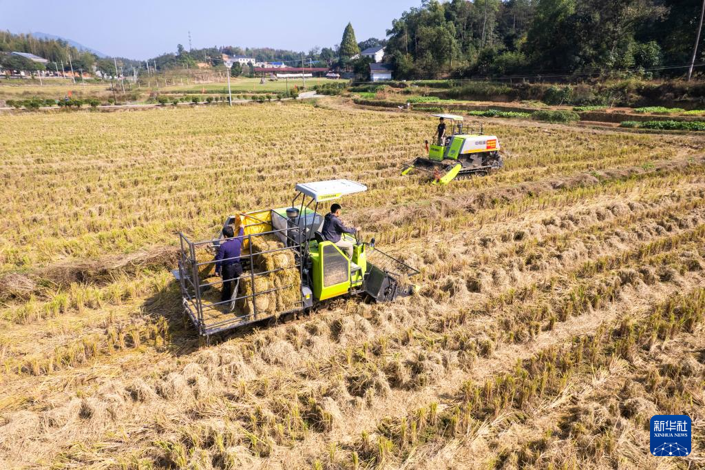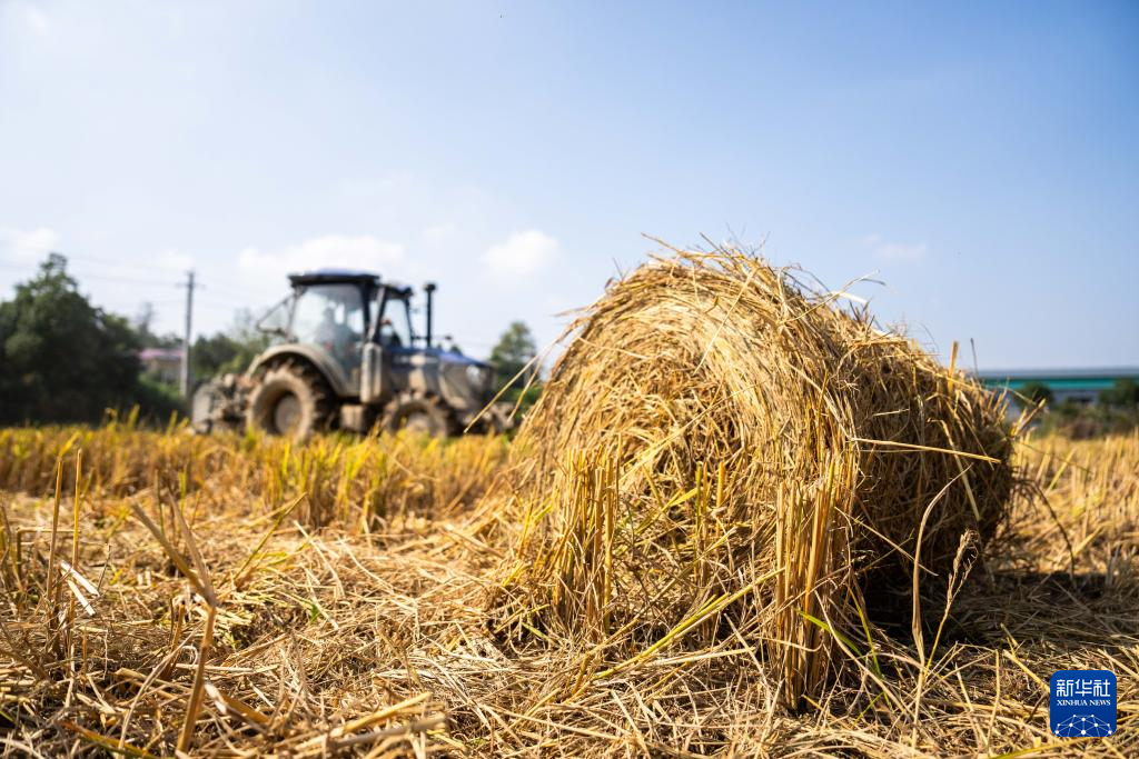 11月5日,在长沙县开慧镇开慧村,村民操作自走式秸秆打捆机回收水稻秸秆。