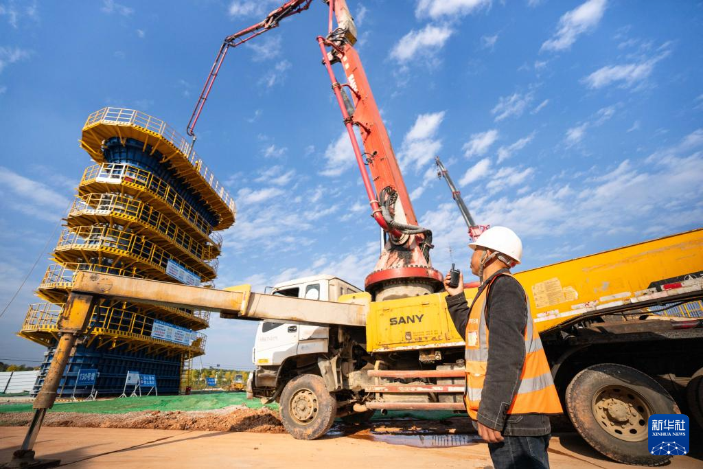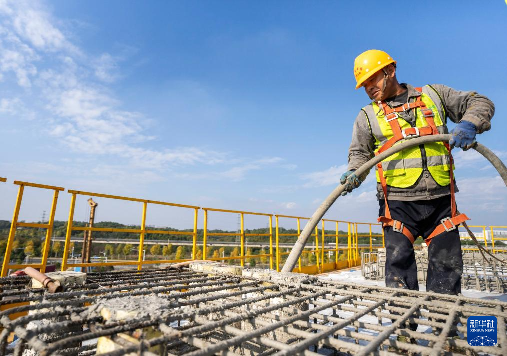 11月5日,在长赣高铁机场高速特大桥施工现场,中铁五局工人在沟通桥墩混凝土浇筑进展。