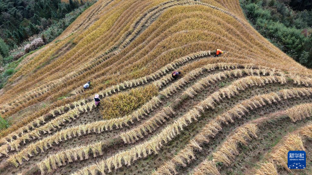 日前,广西桂林市龙胜各族自治县龙脊镇大寨村种植的水稻进入收获季节,梯田之上呈现出一派忙碌的景象。
