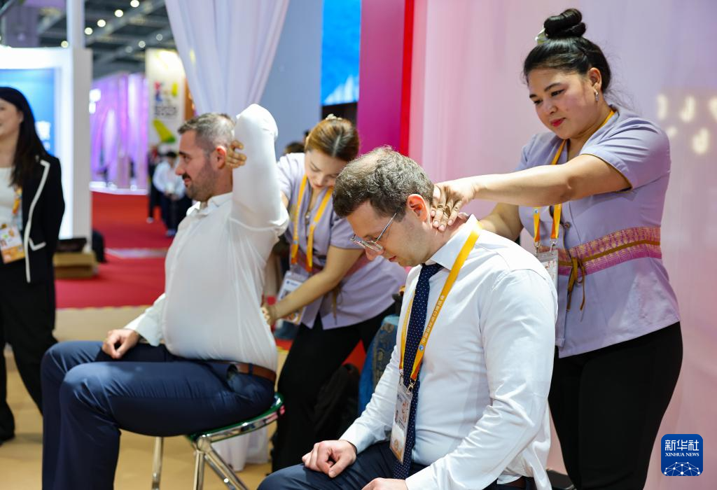 11月5日,人们在第八届进博会国家展泰国馆体验泰式按摩。