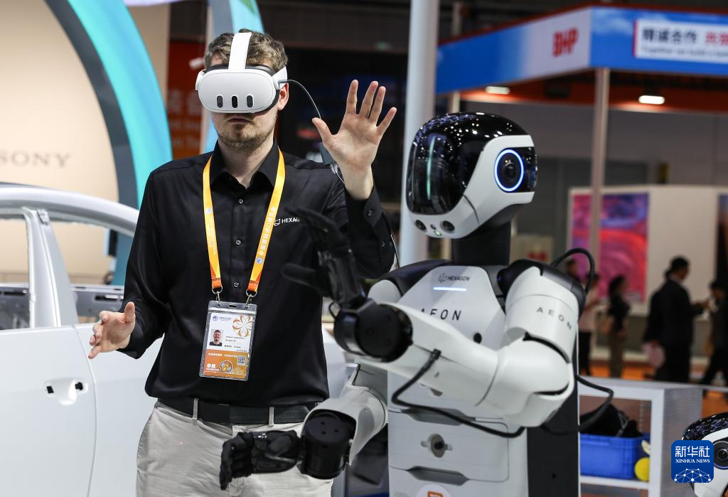 11月5日,工作人员在第八届进博会技术装备展区展示一款工业场景人形机器人。