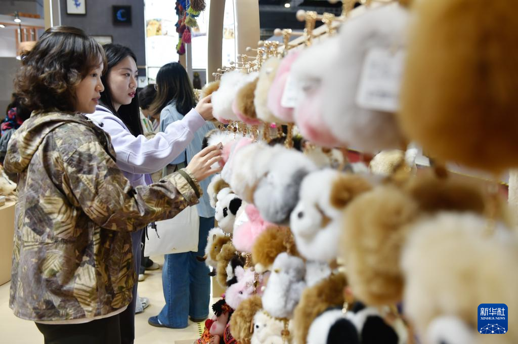 11月5日,观众在第八届进博会消费品展区选购毛绒玩具。