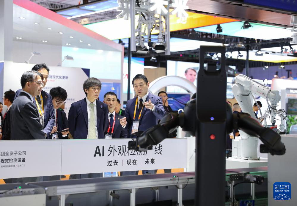 11月5日,观众在第八届进博会技术装备展区三菱电机展台了解AI外观检测产线。
