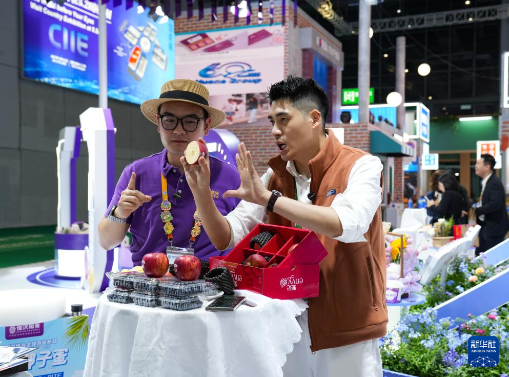11月5日,参展商在第八届进博会农食产品展区直播卖货。