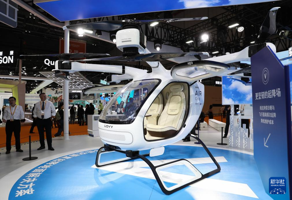 11月5日,人们在第八届进博会汽车及智慧出行展区御风未来展台观看、了解电动垂直起降飞行器。