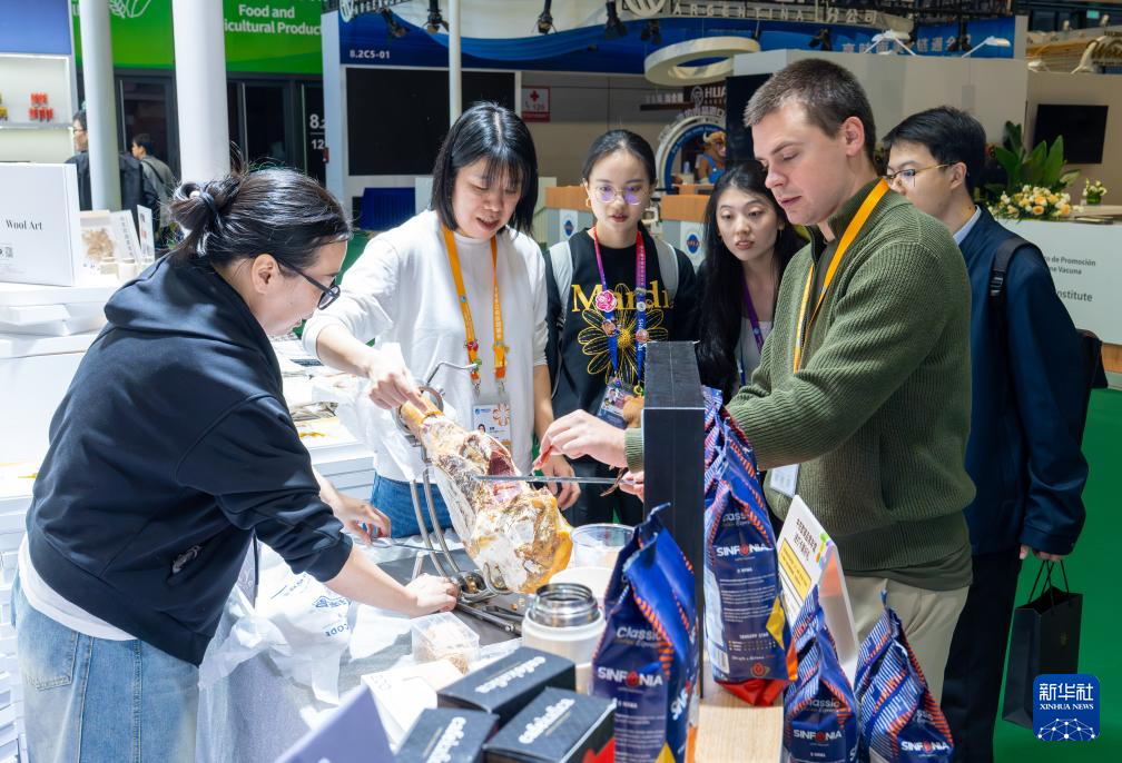 11月5日,观众在第八届进博会农食产品展区大商集团展台品尝进口火腿。
