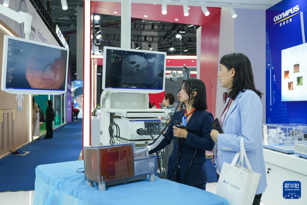 11月5日,在第八届进博会医疗器械及医药保健展区奥林巴斯展台,工作人员演示消化内镜系统。