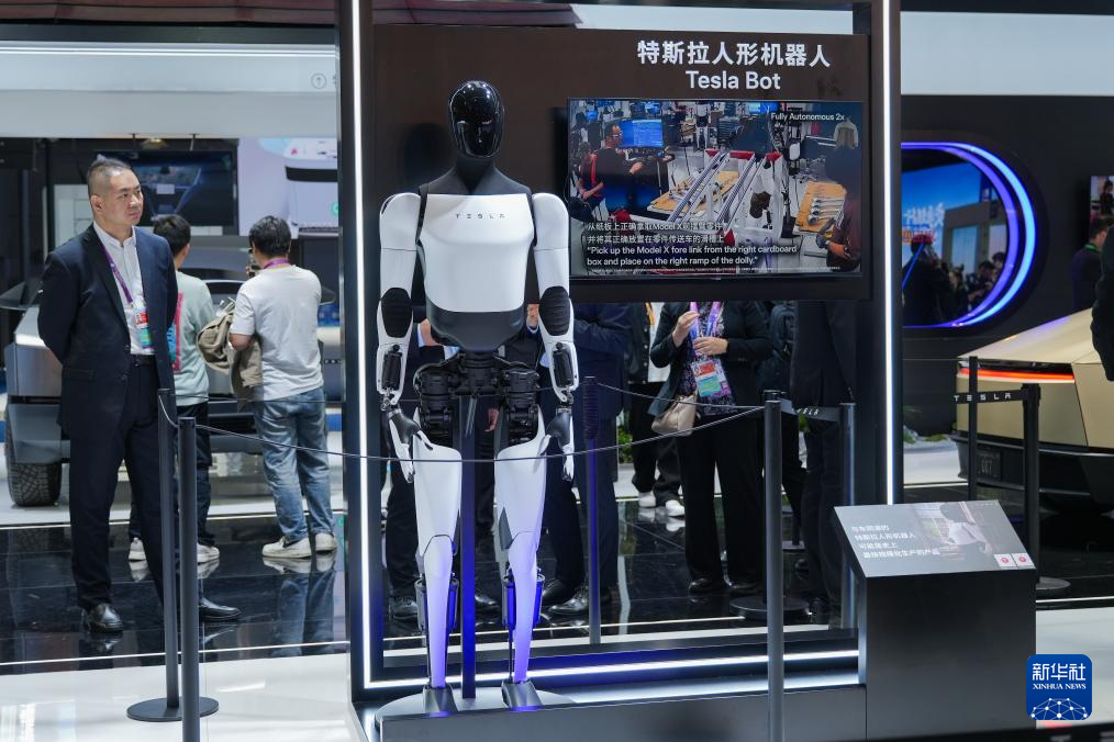 这是11月5日在第八届进博会汽车及智慧出行展区特斯拉展台拍摄的特斯拉人形机器人。