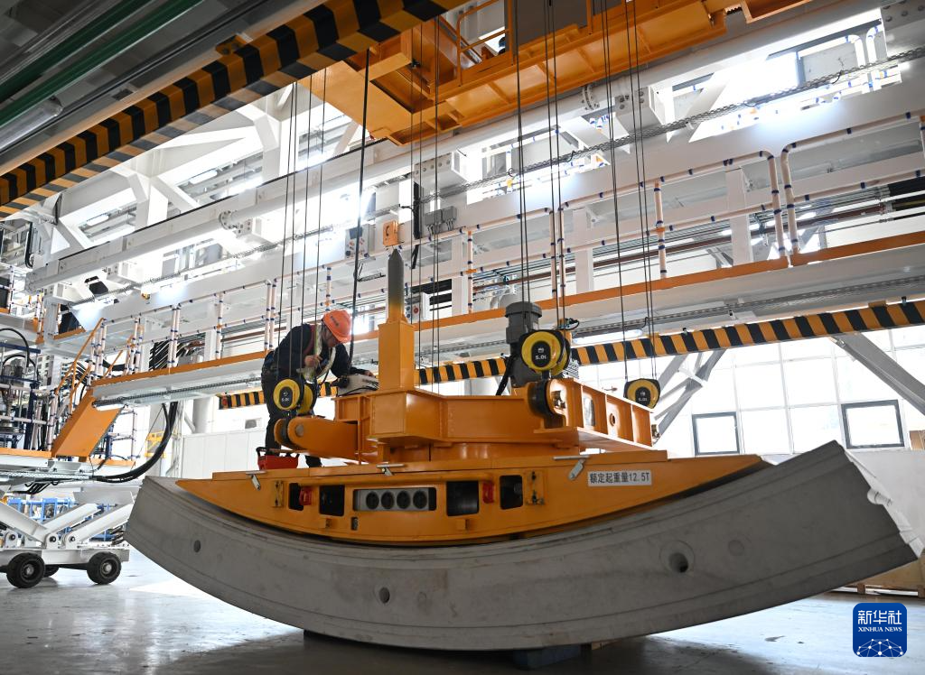 11月3日,工人在位于河南郑州的中铁装备集团车间进行盾构机管片吊机负载调试。