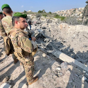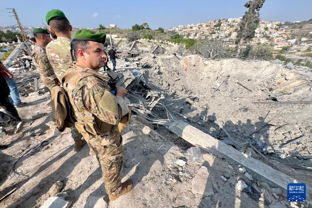 11月6日,在黎巴嫩南部城市提尔的阿巴西耶镇,黎巴嫩民众和军人查看以色列空袭现场。