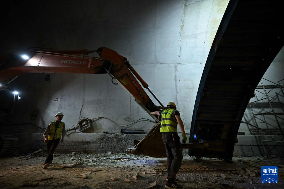 9月11日,工人在塔吉克斯坦卡拉依洪姆村附近的中塔公路二期工程1号隧道施工现场工作。