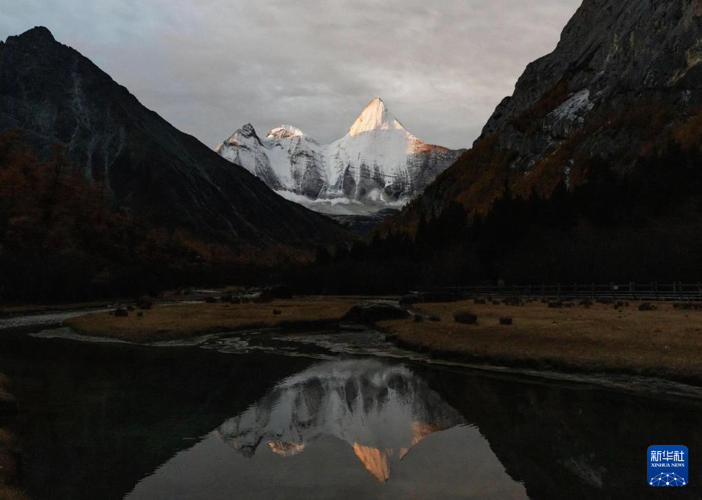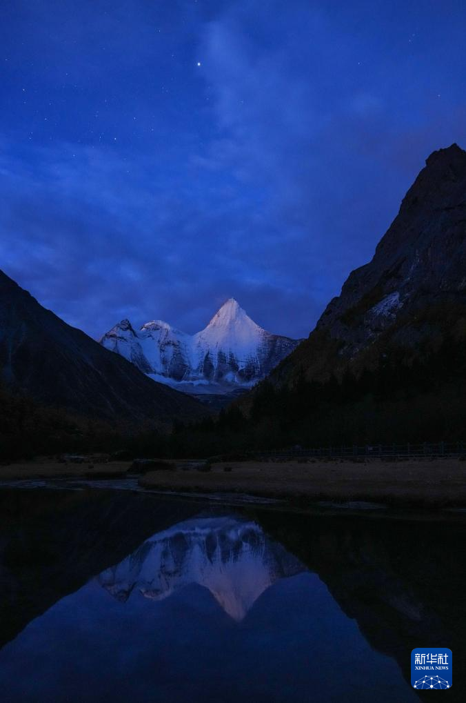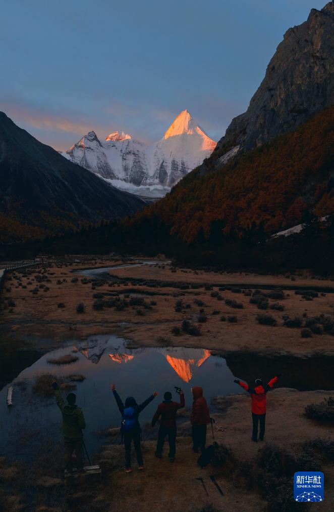 日落时分,夏诺多吉雪山倒映在水中(10月26日摄)。