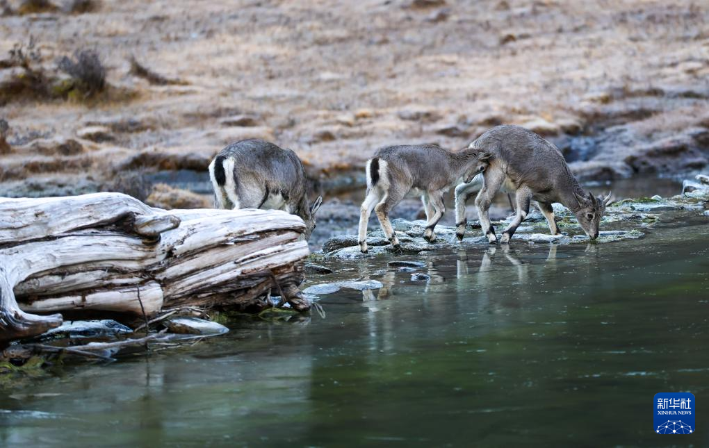在稻城亚丁景区贡嘎措,一群岩羊在喝水(10月27日摄)。