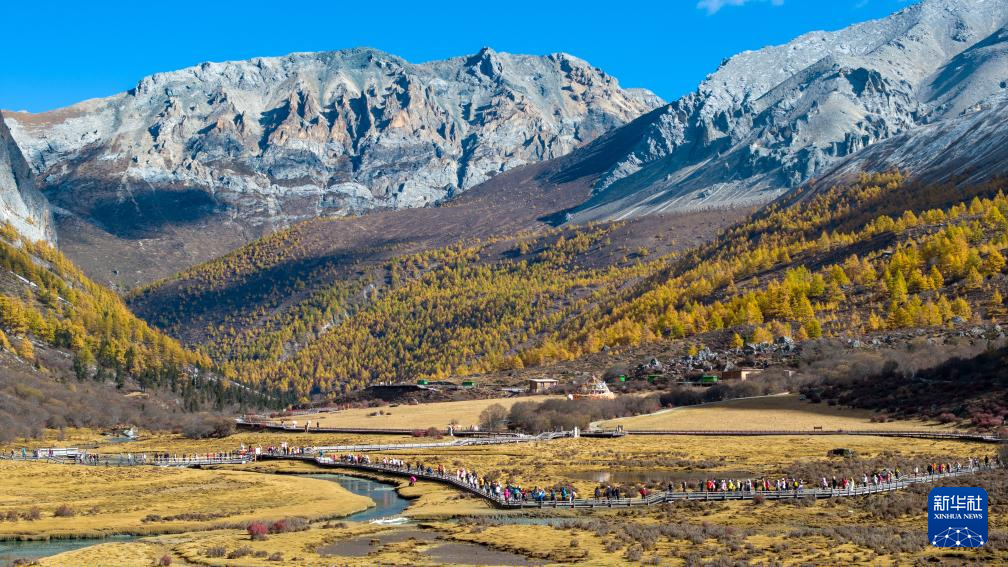 游人走在稻城亚丁景区洛绒牛场步行栈道上(10月29日摄,无人机照片)。