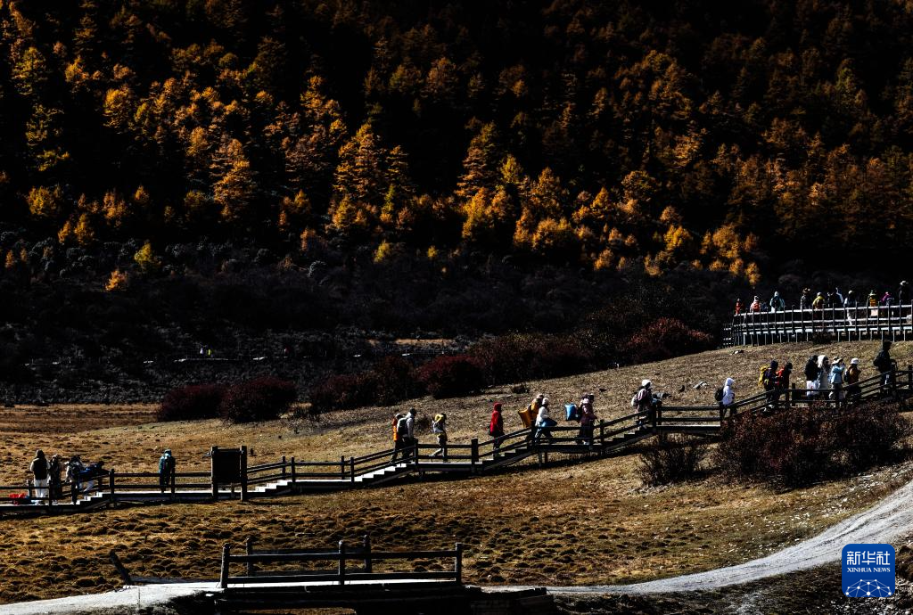 在稻城亚丁景区,游人沿着步行栈道游览(10月29日摄)。