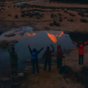 摄影爱好者在拍摄日落时分夏诺多吉雪山在水中的倒影(10月26日摄,无人机照片)。