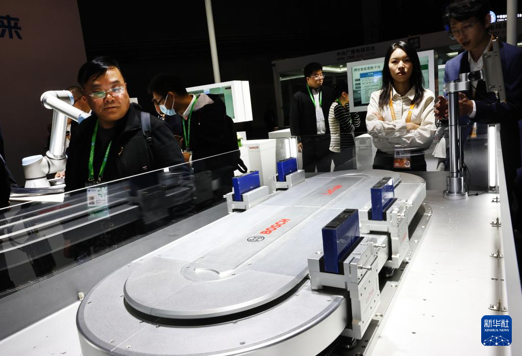 11月6日,参观者在博世公司展台展出的LeTrak磁驱传输系统展品旁驻足观看,这是该产品的全球首发。
