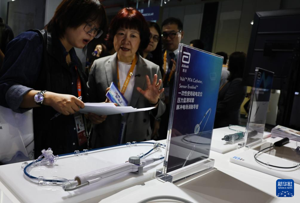 11月6日,参观者在雅培公司一款磁电定位压力监测球囊脉冲电场消融导管展品前驻足观看,这是该产品的亚洲首展。