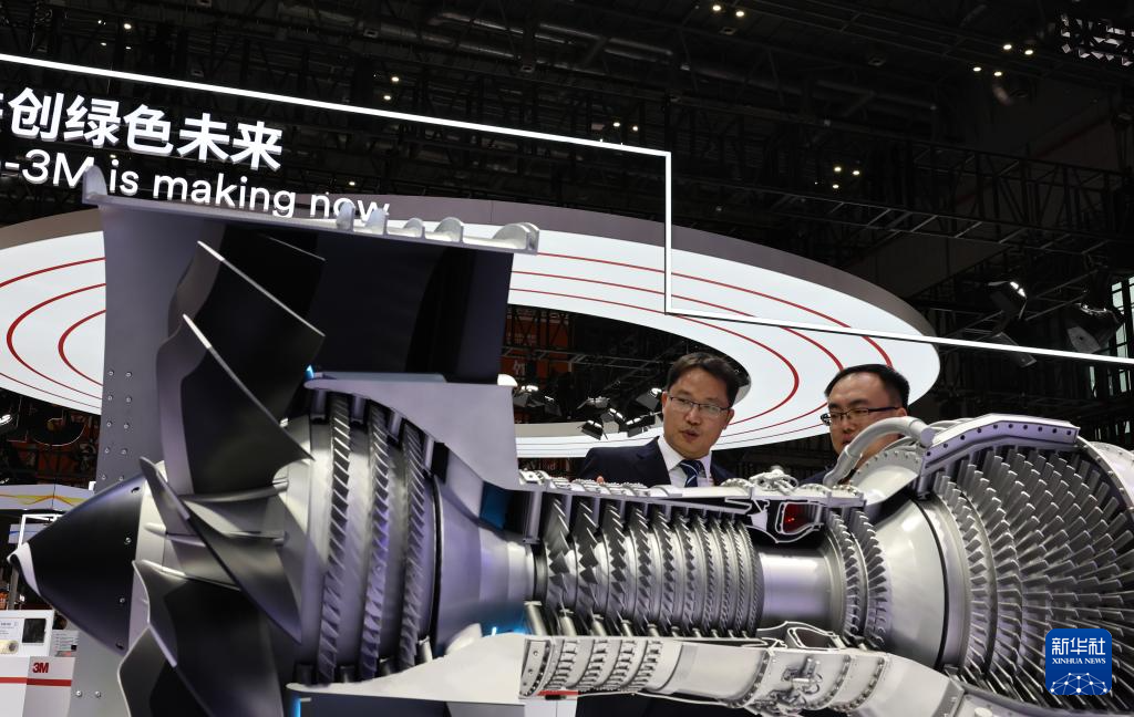 11月5日,参观者在通用电气展台展出的一款LEAP-1C发动机模型前交流讨论,这也是该型号发动机的中国首展。