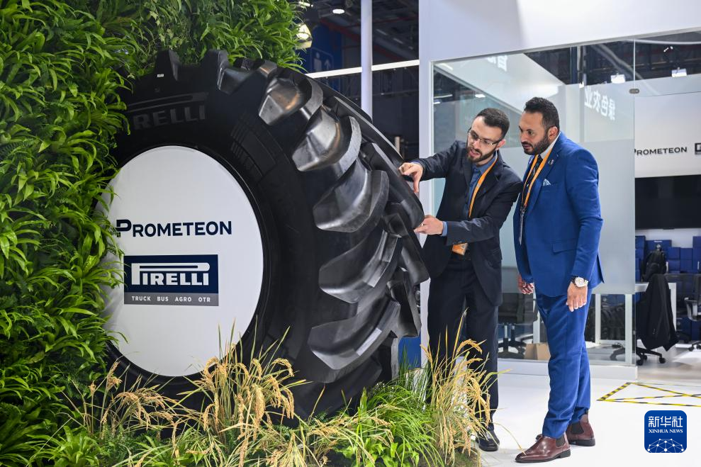 11月6日,在进博会汽车及智慧出行展区百得安轮胎集团展台,展商在亚洲首发产品绿色农业轮胎AT02前交流。