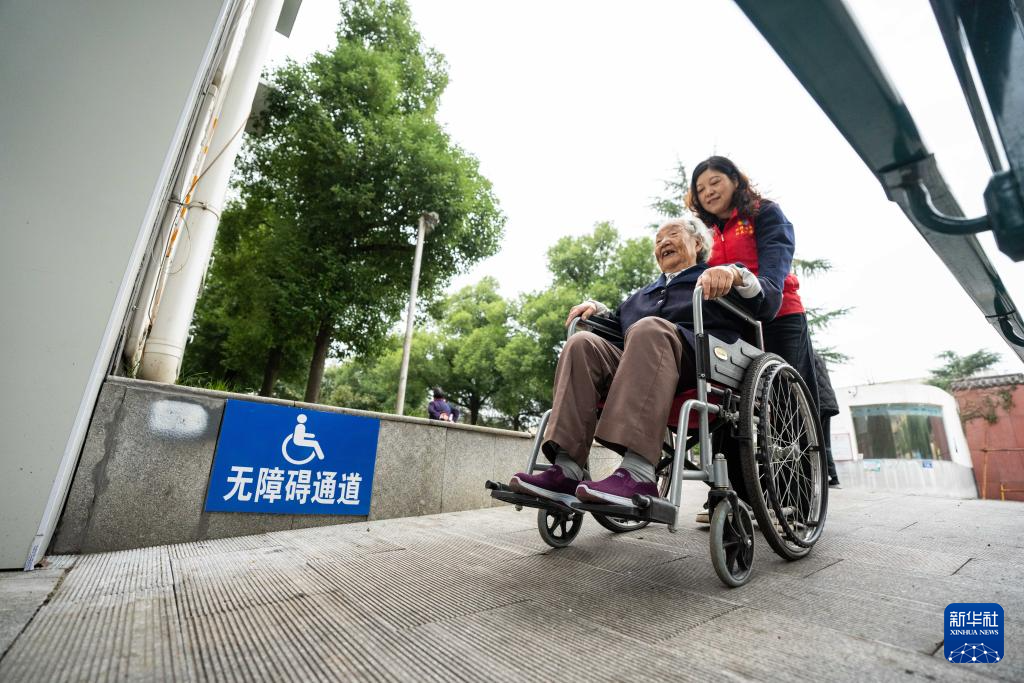 11月6日,在长沙市望城区高塘岭街道湘陵社区,志愿者推行行动不便的居民通过无障碍通道。